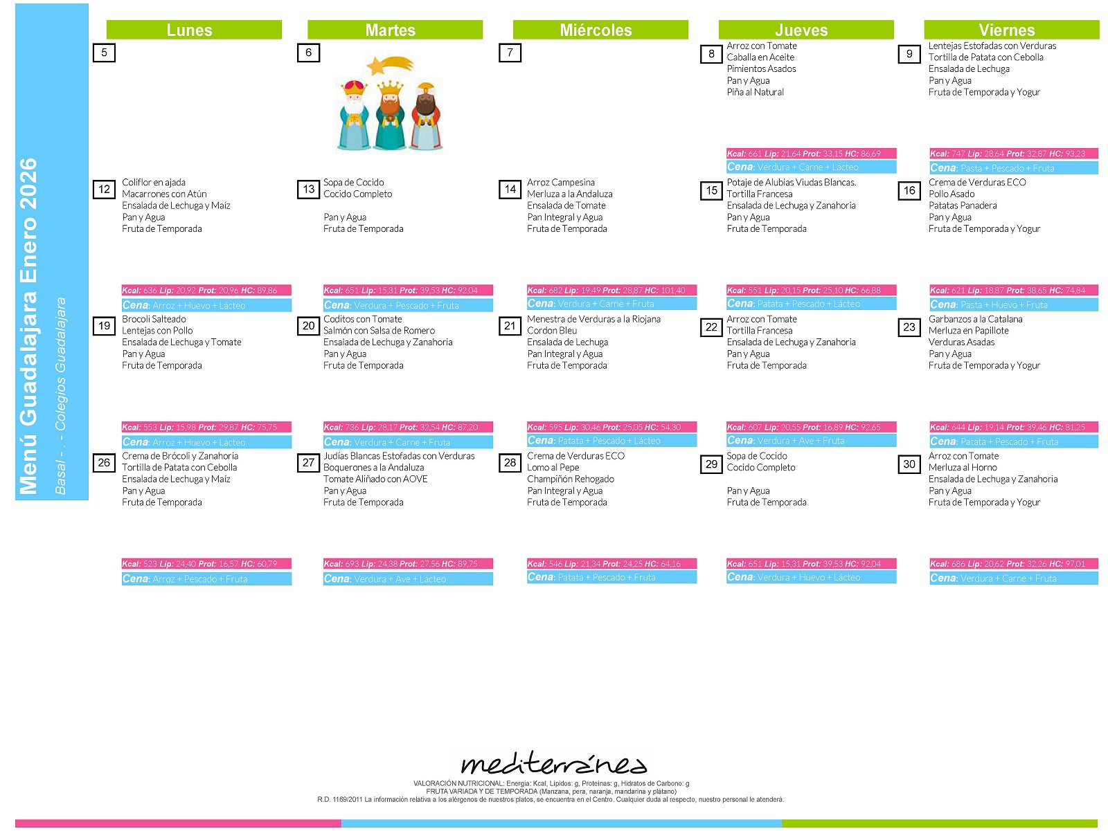 Estimad@s madres y padres: os dejamos los menús escolares del mes de enero de 2026. Deseamos que sean de utilidad para vuestra organización nutricional en los menús caseros.